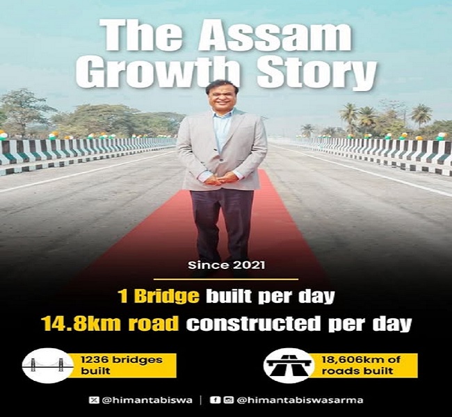 बुधवार काे मुख्यमंत्री डाॅ सरमा ने सोशल मीडिया पर एक पोस्ट शेयर करते हुए सरकार की उपलब्धियों और राज्य में तेज गति से हो रहे विकास पर प्रकाश डाला है। उन्हाेंने लिखा कि राज्य में एक संगठित विकास की गति है। असम में विकास वर्तमान में अभूतपूर्व गति और पैमाने पर चल रहा है। उन्होंने बताया है कि वर्ष 2021 से प्रतिदिन एक पुल और लगभग 15 किमी प्रतिदिन सड़क का निर्माण हो रहा है। इस प्रकार बीते वर्ष दिसंबर माह तक कुल 1,236 पुल और 18,000 किलोमीटर सड़क को आम लोगों की सेवा में समर्पित किया जा चुका है। यह नए असम के विकास के लिए एक नई दृष्टि है।