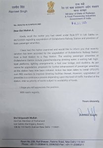 गत 4 दिसंबर 2024 को मैंने लोकसभा में यह विषय गंभीररूप से उठाया था। इसके परिणामस्वरूप माननीय रेल राज्य मंत्री श्री रावनीत सिंह जी के सद्भावनापूर्ण हस्तक्षेप से दुल्लभछड़ा रेलवे स्टेशन को हॉल्ट स्टेशन से फ्लैग स्टेशन में अपग्रेड करने की स्वीकृति प्रदान की गई है।