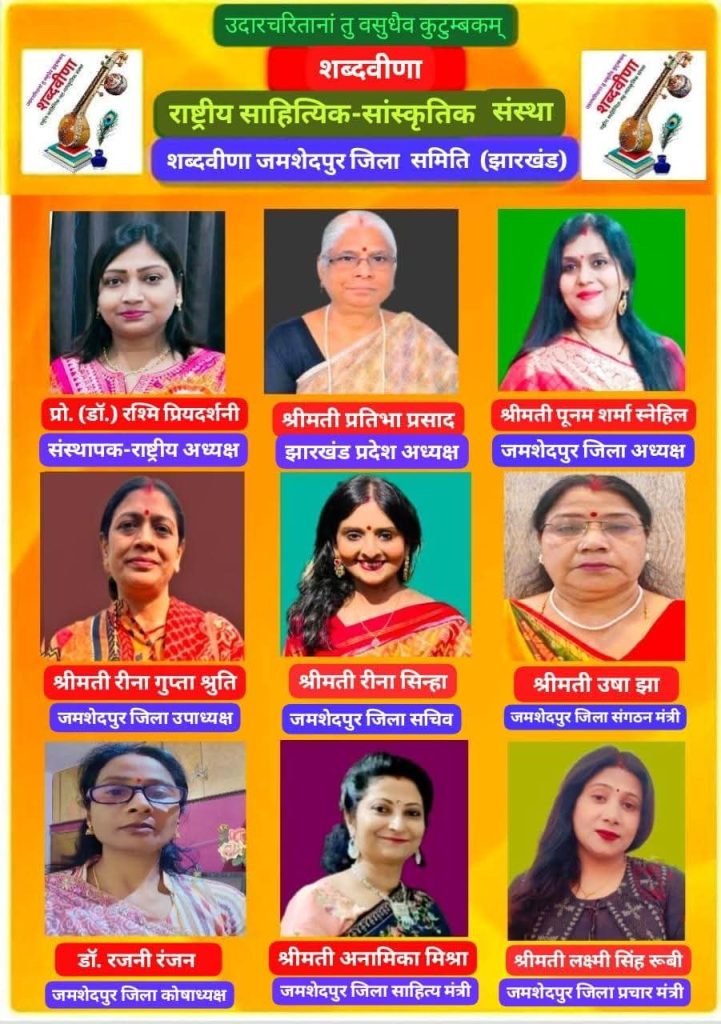 गया। राष्ट्रीय साहित्यिक-सह-सांस्कृतिक संस्था शब्दवीणा की जमशेदपुर जिला समिति का गठन 21 फरवरी, 2025 को अंतरराष्ट्रीय मातृभाषा दिवस के शुभ दिन पूर्ण हुआ। शब्दवीणा की संस्थापक प्रो. डॉ. रश्मि प्रियदर्शनी ने बताया कि शब्दवीणा की झारखंड प्रदेश अध्यक्ष वरिष्ठ कवयित्री प्रतिभा प्रसाद, जमशेदपुर जिला समिति की संरक्षक कवयित्री निवेदिता श्रीवास्तव एवं जिला अध्यक्ष पूनम शर्मा स्नेहिल के नेतृत्व में गठित इस समिति में जिला उपाध्यक्ष रीना गुप्ता श्रुति, जिला सचिव रीना सिन्हा, जिला संगठन मंत्री उषा झा, जिला कोषाध्यक्ष डॉ. रजनी रंजन, जिला साहित्य मंत्री अनामिका मिश्रा एवं जिला प्रचार मंत्री लक्ष्मी सिंह रूबी को बनाया गया है। शब्दवीणा जमशेदपुर जिला समिति की अध्यक्ष पूनम शर्मा स्नेहिल एवं सभी नव मनोनीत पदाधिकारियों को शब्दवीणा की राष्ट्रीय अध्यक्ष डॉ. रश्मि प्रियदर्शनी, शब्दवीणा के राष्ट्रीय परामर्शदाता मंडल सदस्य एवं झारखंड प्रदेश संरक्षक प्रो. रामनंदन सिंह, राष्ट्रीय उप कोषाध्यक्ष सह पूर्व झारखंड प्रदेश अध्यक्ष मनोज कुमार सिंह, बिहार प्रदेश संरक्षक प्रो. सुबोध कुमार झा, शब्दवीणा झारखंड के प्रदेश उपाध्यक्ष अरुण कुमार यादव, प्रदेश सचिव अर्पणा कुमारी, प्रदेश संगठन मंत्री डॉ. रजनी शर्मा चंदा, प्रदेश कोषाध्यक्ष श्री शेखर, प्रदेश साहित्य मंत्री प्रो. नूतन शर्मा, प्रदेश प्रचार मंत्री आशीष जैन, शब्दवीणा गोड्डा जिला अध्यक्ष सुरजीत झा, देवघर जिला अध्यक्ष डॉ. विजय शंकर, पाकुड़ जिला अध्यक्ष राम रतन सिंह, गोड्डा जिला समिति के पदाधिकारी शैलेन्द्र प्रसाद, मणिकांत प्रसाद, फूल कुमारी, अजय झा आदि ने हार्दिक शुभकामनाएं दी हैं।