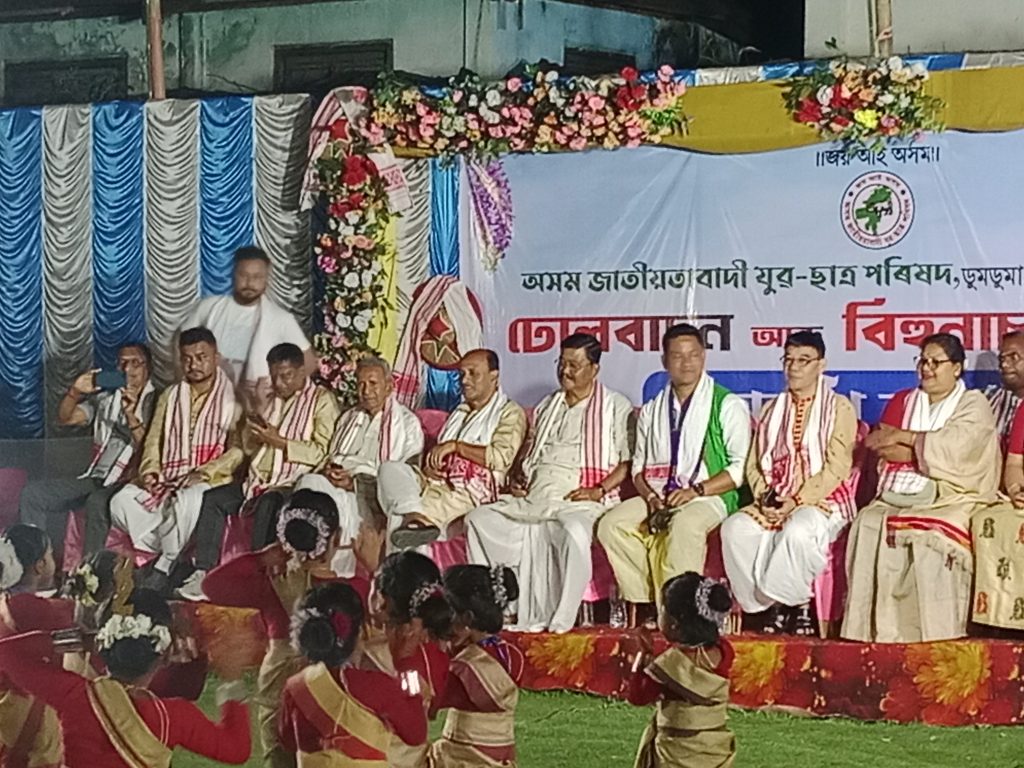 दुमदुमा प्रेरणा भारती 17 अप्रैल : अखिल असम जातीयता वादी युवा छात्र परिषद के दुमदुमा आंचलिक समिति द्वारा 11 दिवसीय ढोल वादन बिहू नृत्य आखड़ा का प्रशिक्षण शिविर का समापन नगर खेल मैदान में रंगारंग सांस्कृतिक कार्यक्रम के साथ हुआ। कल शाम को दुमदुमा नगर खेल मैदान में आयोजित कार्यक्रम में अखिल असम जातीयता वादी युवा छात्र परिषद के तिनसुकिया जिला समिति के अध्यक्ष कल्याण ज्योति मोरान, केन्द्रीय समिति के सुरजीत मोरान ,महिला जातीय परिषद के अध्यक्षा मृनाली नेउग ,जिला सचिव मायनी लाहन , दुमदुमा शाखा साहित्य सभा के अध्यक्ष देवेन डेका, मोरान छात्र संस्था के केंद्रीय सचिव जयकांत मोरान ,आसू के केंद्रीय समिति के पूर्व सह सचिव राणा सोनार, तिनसुकिया जिला साहित्य सभा के पूर्व अध्यक्ष वरिष्ठ पत्रकार अर्जुन बरुआ, दुमदुमा पौर सभा के पूर्व अध्यक्ष दुलू आरंनधरा, विशिष्ट चिकित्सक डॉ प्रणव ज्योति डेका , ,वरिष्ठ व्यवसाय राजू गरोदिया सहित गण्यमान्यों व्यक्ति उपस्थित रहे। इस मौके पर सभी प्रशिक्षक को सम्मानित किया गया तथा प्रतिभागियों को प्रशस्ति पत्र प्रदान किया गया। कार्यक्रम की संचालन परिषद के आंचलिक सह सचिव छत्रपति मोरान ने किया।