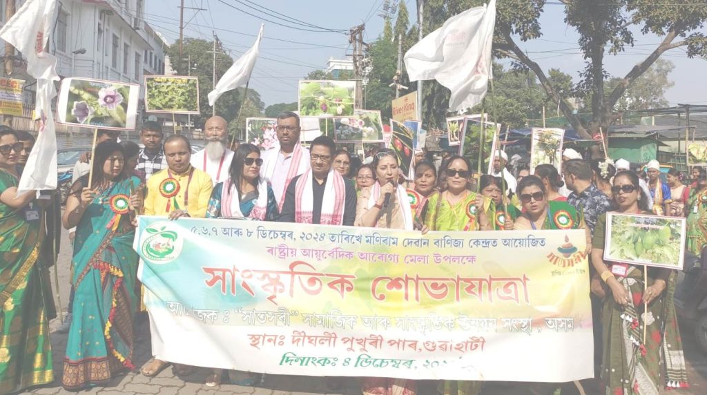 गुवाहाटी, 4 दिसंबर। असम की संस्कृति और परंपरा को संरक्षित करने के उद्देश्य से सामाजिक और सांस्कृतिक विकास संगठन ‘शतशोर’ के तत्वावधान में बुधवार को लताशिल खेल के मैदान से रंगारंग शोभायात्रा निकाली गई। शोभायात्रा का शुभारंभ प्रतिदिन टाइम के प्रधान संपादक नितुमोनी सैकिया और एनबी न्यूज के मालिक नृपेन दास ने किया। इस मौके पर शतशोर की अध्यक्ष प्रियनारी डॉ. मंदिरा बरुआ, सेवानिवृत्त वरिष्ठ महाप्रबंधक (ओआईएल) तथा राष्ट्रीय स्वास्थ्य मेले के मुख्य सलाहकार मैनाक पात्रा, भारत सरकार के वन और जलवायु परिवर्तन के क्षेत्रीय निदेशक डॉ. हेमेन हजारिका, सहायक प्रोफेसर देवजीत दास सहित अन्य गणमान्य व्यक्ति उपस्थित थे। दोनों ही अतिथियों ने अपने संबोधन में शतशोर के इस प्रयास की सराहना करते हुए कहा कि संस्था की अध्यक्ष डॉ. मंदिरा बरुवा प्राचीन आयुर्वेद को संरक्षित करने की दिशा में शानदार कार्य कर रही है। अतिथियों ने अपनी ओर से डॉ. मंदिरा बरुवा के नेतृत्व में आयोजित होने वाले चार दिवसीय राष्ट्रीय आरोग्य मेले के सफल आयोजन हेतु शुभकामनाएं प्रेषित की।