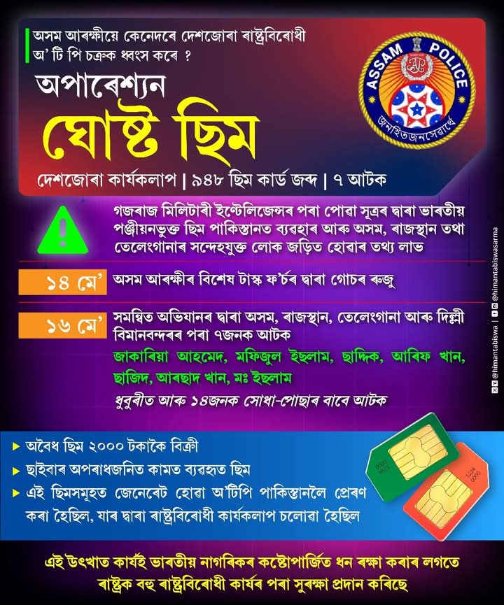 ज्ञात हो कि असम पुलिस ने हाल ही में देश के अन्य कई हिस्सों में अभियान चलाकर अवैध सिम कार्य के साइबर अपराध का भंडाफोड़ किया था।