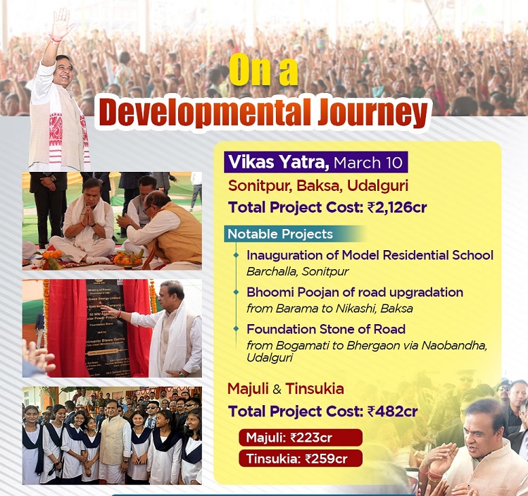 गुवाहाटी (असम), 10 मार्च । मुख्यमंत्री डॉ हिमंत बिस्व सरमा की विकास यात्रा आज राज्य के बोडोलैंड क्षेत्र के उदालगुड़ी पहुंची। उदालगुड़ी में मुख्यमंत्री ने राज्य के बुनियादी ढांचे को बदलने, महिलाओं को सशक्त बनाने और शैक्षिक अवसरों को बढ़ाने के उद्देश्य से कई महत्वाकांक्षी विकास परियोजनाओं की घोषणा की।