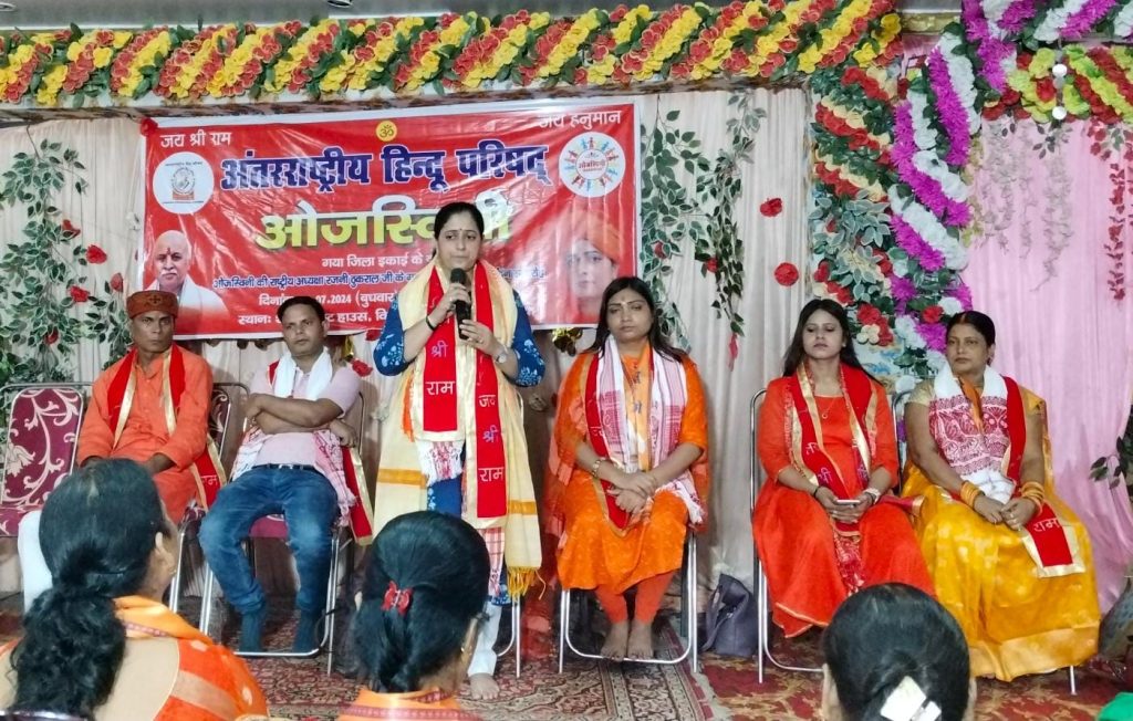 गया। बुधवार को विष्णुपद मार्ग स्थित शगुन गेस्ट हाउस में अंतरराष्ट्रीय हिन्दू परिषद की महिला शाखा ओजस्विनी के बैनर तले ओजस्विनी की राष्ट्रीय अध्यक्ष के गया प्रवास पर ओजस्विनी की गया जिलाध्यक्षा डॉ. रश्मि प्रियदर्शनी की अध्यक्षता में अभिनंदन समारोह का आयोजन किया गया। मंचासीन अतिथियों सहित उपस्थित सभी कार्यकताओं ने ओंकार के तीन बार उच्चारण तथा विजयमंत्र “श्री राम, जय राम, जय-जय राम” के उद्वघोष के साथ कार्यक्रम का शुभारंभ किया। मुख्य अतिथि ओजस्विनी की राष्ट्रीय अध्यक्ष रजनी ठुकराल, ओजस्विनी की गया जिलाध्यक्षा डॉ. रश्मि प्रियदर्शनी, शशिकांत मिश्र प्रांत महामंत्री, राष्ट्रीय बजरंग दल, डॉ. शिववचन प्रसाद सिंह, जिलाध्यक्ष, अहिप, राम बारीक, विभाग महामंत्री, मधु शर्मा, जिलाध्यक्ष, राष्ट्रीय महिला परिषद, मुक्तामणि, कार्याध्यक्ष, अहिप ने संयुक्त रूप से भगवान श्री राम के चित्र पर माल्यार्पण के साथ दीप प्रज्वलित किया। तत्पश्चात ओजस्विनी की गया जिलाध्यक्ष डॉ रश्मि प्रियदर्शनी ने ओजस्विनी की राष्ट्रीय अध्यक्ष रजनी ठुकराल का स्वागत अंगवस्त्र एवं पुष्पमाला पहनाकर किया।