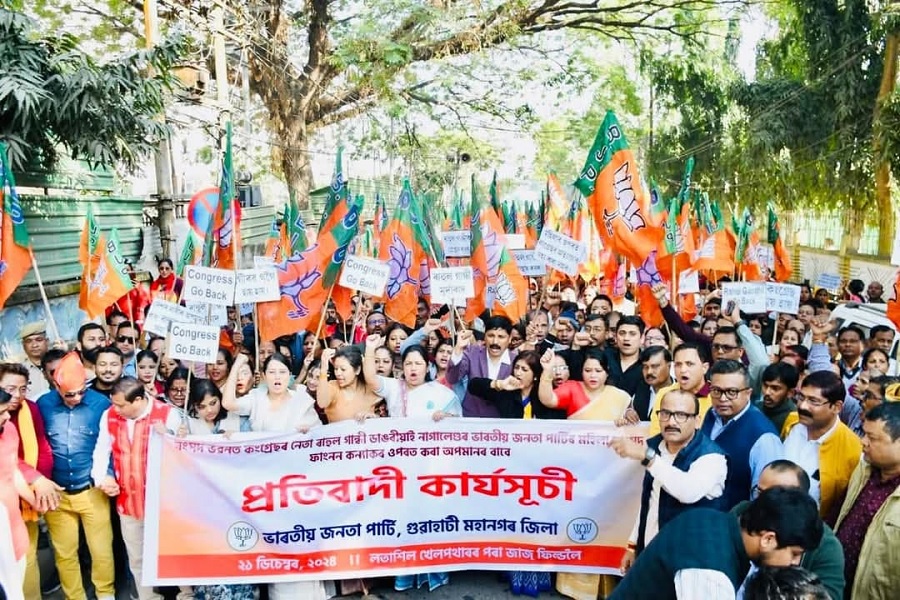 गुवाहाटी, 21 दिसंबर (हि.स.)। प्रदेश भाजपा पार्टी ने आज गुवाहाटी में बड़े पैमाने पर विरोध प्रदर्शन किया। कांग्रेस नेता और लोकसभा में विपक्ष के नेता राहुल गांधी पर संसद भवन परिसर में नगालैंड की भाजपा महिला सांसद फांगनोन कोन्याक का अपमान करने का आरोप लगाते हुए आज विरोध प्रदर्शन किया।