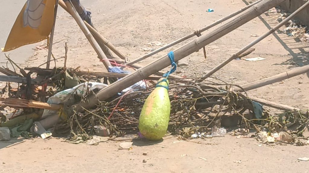 राजू दास की विशेष रिपोर्ट, शिलचर, 2 मई 2025: शिलचर के मेहरपुर इलाके में हाल ही में एक अनोखे विरोध प्रदर्शन की तस्वीर सामने आई है। टूटी-फूटी सड़क पर पेड़ की टहनियों, बांस और कचरे के ढेर के साथ एक लौकी को गले में रस्सी डालकर लटकाया गया है। उसके पास एक राजनीतिक दल का झंडा भी बंधा हुआ है। स्थानीय लोगों का कहना है कि यह कोई मज़ाक नहीं, बल्कि एक तीव्र सामाजिक विरोध है—जहां ‘आत्महत्या’ कर ली है एक लौकी ने!