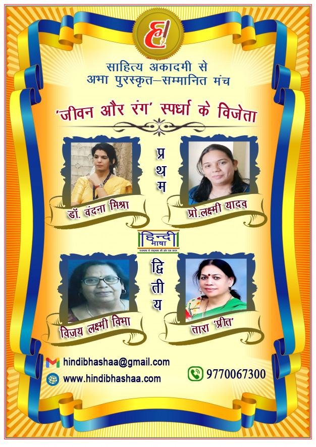 इंदौर (मप्र)। मातृभाषा हिंदी के प्रचार की दृष्टि से हिंदीभाषा डॉट कॉम परिवार द्वारा निरन्तर स्पर्धा का आयोजन जारी है। इसी क्रम में 65 वीं स्पर्धा ‘जीवन और रंग’ विषय पर कराई गई। इसमें पद्य वर्ग में डॉ. वंदना मिश्रा ‘मोहिनी’ ने और गद्य वर्ग में प्रो. लक्ष्मी यादव ने प्रथम स्थान प्राप्त किया है।