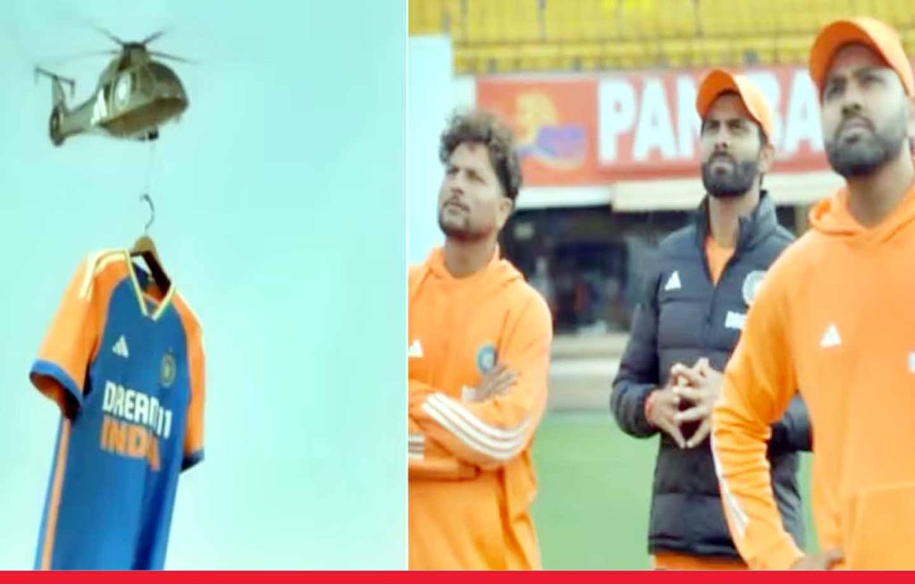 टीम इंडिया की जर्सी का मेन स्पॉन्सर ड्रीम 11 है. दूसरा स्पॉन्सर एडिडास है. जर्सी के सेंटर पर ड्रीम 11 व्हाइट से लिखा है. उसके नीचे रेड कलर में टीम इंडिया लिखा है. ड्रीम 11 के ऊपर लेफ्ट साइड एडिडास तो दूसरी और बीसीसीआई का लोगो बना हुआ है. भारतीय टीम की जर्सी के कॉलर में तिरंगे का रंग है. हेलिकॉप्टर हवा में टीम इंडिया की जर्सी पहाड़ों में लहराता हुआ आगे बढ़ता दिखा रहा. कप्तान रोहित शर्मा कुलदीप यादव और रविंद्र जडेजा जर्सी को देखे जा रहे हैं.