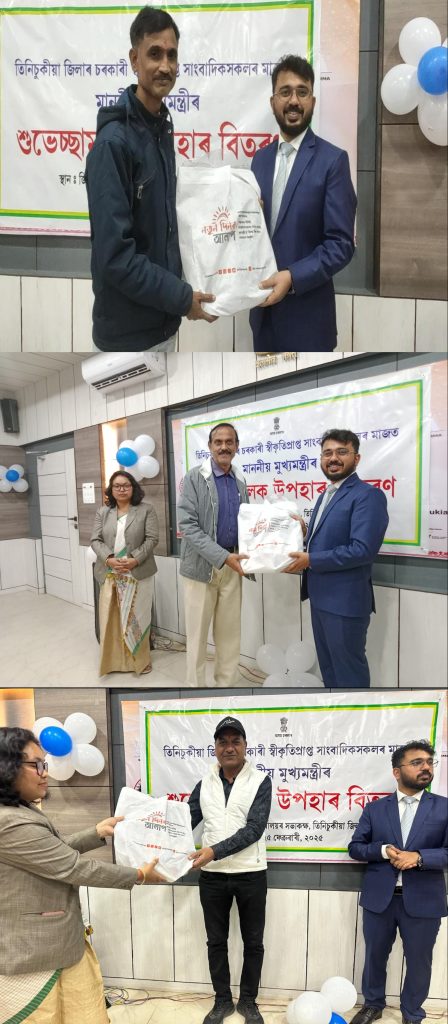 तिनसुकिया, प्रेरणा भारती 25 फरवरी: मुख्यमंत्री डॉ हिमंत विश्व शर्मा द्वारा सरकारी मान्यता प्राप्त पत्रकारो के लिये भेजे गये अभिवादन उपहार को आज तिनसुकिया जिले के पत्रकारों के बीच आधिकारिक तौर पर वितरित किया गया।जिला आयुक्त कार्यालय के सभागार में जिला आयुक्त स्वप्निल पाल की उपस्थिति में इस उपहार वितरण कार्यक्रम का आयोजन हुआ।