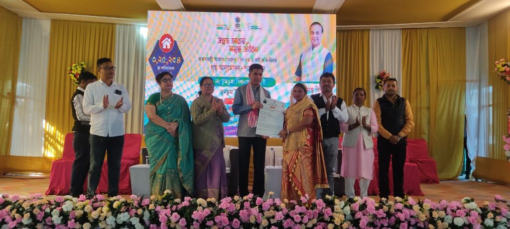 9 दिसम्बर :– दुमदुमा अंचल के रूपाई साइडिंग में मंत्री रूपेश ग्वाला ने प्रधानमंत्री आवास योजना का अनुमोदन पत्र प्रदान किया। । आज रूपाई साइडिंग के कला कृष्टी केन्द्र में आयोजित सभा में विधानसभा क्षेत्र के अन्तर्गत कुल 2306 परिवारों को प्रधानमंत्री आवास योजना PMAY घरों के लाभार्थियों को गृह अनुमोदन पत्र स्थानीय विधायक मंत्री रूपेश ग्वाला ने वितरित किया। इस कार्यक्रम का आयोजन असम सरकार तथा दुमदुमा सम-जिला के सहयोग से किया गया था।इस कार्यक्रम में दुमदुमा सम-जिला आयुक्ता नूसरत नसरीन , दुमदुमा पौर सभा अध्यक्षा कान्ता भट्टाचार्य , आंचलिक पंचायत अध्यक्ष भरत भजनी सहित विभिन्न लोग उपस्थित थे।