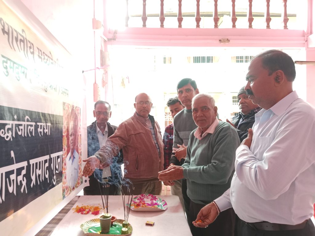 दुमदुमा 4 मार्च :– दुमदुमा में अखिल भारतीय मध्यदेशीय वैश्य सभा द्वारा अखिल भारतीय मध्यदेशीय वैश्य सभा के पूर्व राष्ट्रीय उपाध्यक्ष एवं असम प्रदेश के अध्यक्ष स्वर्गीय राजेन्द्र प्रसाद गुप्ता को श्रद्धांजलि दी गई। आज हिन्दुस्तानी दूर्गा पूजा पंडाल में एक श्रद्धांजलि सभा आयोजित की गई। मालूम हो कि pगत दिनों गुवाहाटी मेडिकल कॉलेज में राजेंद्र प्रसाद गुप्ता का असामयिक निधन हो गया था। शोक व्यक्त करते हुए श्रद्धांजलि दी गई । तिनसुकिया जिला समिति के अध्यक्ष गोरख प्रसाद गुप्ता दुमदुमा आंचलिक के पूर्व अध्यक्ष वरिष्ठ शिक्षक ललन गुप्ता ने स्व राजेन्द्र प्रसाद गुप्ता के प्रतिछबि के सम्मुख दीप प्रज्ज्वलित किया एवं पुष्पांजली अर्पित कर शोक व्यक्त किया गया । तत्पश्चात स्वर्गीय गुप्ता के आत्मा की शान्ति के लिए एक मिनट का मौन धारण किया गया। समाज के उपस्थित लोगों ने फुलमाला अर्पित कर श्रद्धांजलि दी। इस श्रद्धांजलि सभा में दुमदुमा आंचलिक के पूर्व अध्यक्ष ललन प्रसाद गुप्ता (शिक्षक) ने सभा को संबोधित करते हुए कहा कि उनके द्वारा मध्यदेशिय वैश्य सभा के कार्यकाल के दौरान राष्ट्रीय स्तर तथा असम के अध्यक्ष पद पर आसीन हो कर किये गये कार्यों द्वारा समाज को एक नये ऊर्जावान बनाया तथा समाज को नये स्तर पर ले गए । उनके आवदानो का समाज हमेशा ऋणी रहेगा। इस श्रद्धांजलि कार्यक्रम में किरण गुप्ता , केदारनाथ गुप्ता , ओमप्रकाश गुप्ता , अरविंद गुप्ता (बाबु) , राहुल गुप्ता , अमीत गुप्ता , अरविंद गुप्ता सहित समाज के कई गणमान्य व्यक्ति उपस्थित रहे। सभा का संचालन गोरखनाथ गुप्ता (पत्रकार) द्वारा कि गया ।