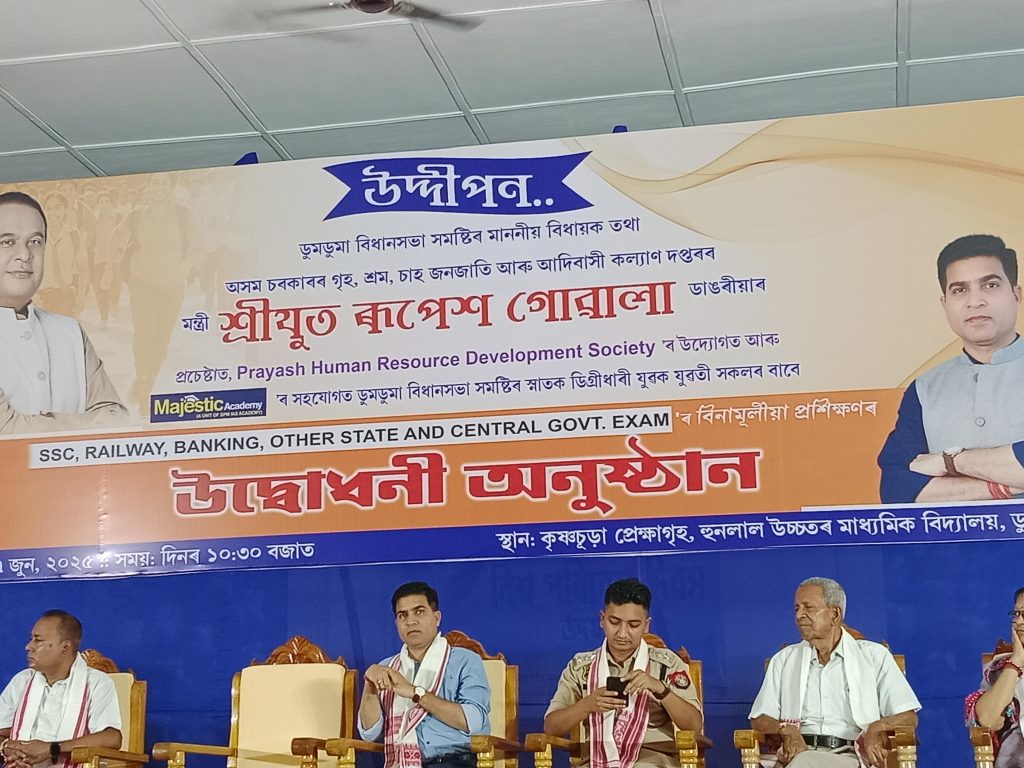 दुमदुमा प्रेरणा भारती 7 जुन — दुमदुमा विधानसभा क्षेत्र के विधायक तथा असम सरकार के श्रमिक कल्याण, चाय जनजाति और आदिवासी कल्याण और गृह विभाग के केविनेट मंत्री रूपेश ग्वाला ने दुमदुमा विधानसभा क्षेत्र में शैक्षिक दिशा की ओर उत्थान के लिए ” उद्दीपन ” नामक एक विशेष कार्यक्रम हाथ में लिया है। इस कार्यक्रम के अंतर्गत प्रथम बार दुमदुमा विधानसभा क्षेत्र के अंतर्गत स्नातक डिग्रीधारी नौकरी के लिए प्रयास करने वाले युवक युवतियों को कॉम्पिटेटिव एक्जाम  की तैयारियों के लिए निःशुल्क प्रशिक्षण प्रदान करने की व्यवस्था की गई है। इस कार्यक्रम के जरिए स्नातक किए जाने के बाद छात्र-छात्राओं को बैंक,  ,रेलवे,असम डायरेक्ट रिक्रूटमेंट एग्जामिनेशन , कर्मचारी चयन आयोग की परीक्षा की तैयारी के लिए प्रतियोगिता मुलक परीक्षा में पास होने के लिए पहले से ही शिक्षार्थियों को खुद तैयार होने का बेहतर अवसर मिलेगा। यह प्रशिक्षण प्रयास हुमेन रिसोर्स डेवेलपमेन्ट सोसायटी के सौजन्य और मेजेस्टीक अकादमी, गुवाहाटी के सहयोग से प्रदान किया जाएगा। मुख्य अतिथि मंत्री रूपेश ग्वाला की उपस्थिति में इस प्रशिक्षण का उद्घाटन कार्यक्रम में आज दुमदुमा के हुनलाल उच्चतर माध्यमिक विद्यालय प्रांगण के कृष्णचुड़ा में आयोजित किया गया। इस उद्घाटन कार्यक्रम में तिनसुकिया जिला आयुक्त स्वप्निल पाल , दुमदुमा सम जिला के पुलिस अधीक्षक दिगंत दत्त , दुमदुमा पौर सभा की सभा नेत्री कांता भट्टाचार्य , दुमदुमा कॉलेज के अध्यक्ष डॉ कमलेश्वर कलिता , दुमदुमा कॉलेज के परिचालना समिति के सभापति प्रकाश दत्त , विशिष्ट समाजसेवी अर्जुन बरूआ , दुमदुमा कॉलेज के अवसर प्राप्त उपाध्यक्ष बीणा देवी बरदलै , विशिष्ट चिकित्सक तथा समाजसेवी डॉ प्रणव ज्योति डेका , मेजेस्टीक अकादमी के प्रतिनिधि पलाश गोगोई उपस्थित रहे। उद्दीपन परिचालना समिति के सदस्य प्रकाश दत्त ने स्वागत भाषण दिया। जिला आयुक्त स्वप्निल पाल और समजिला पुलिस अधीक्षक दिगंत दत्त ने प्रशिक्षार्थियों को अनुप्रेरक वक्तव्य प्रदान दिया। इस कार्यक्रम का संचालन उद्दीपन परिचालना समिति के आहवायक द्वय दिलीप प्रसाद और अभिजीत खाटनियार ने किया। स्थानीय विधायक तथा मंत्री रूपेश ग्वाला के प्रयास से होने वाले इस प्रशिक्षण के लिए सभी ने प्रशंसा की। इस प्रशिक्षण में दुमदुमा विधानसभा क्षेत्र के दो सौ से अधिक युवक युवतियों ने भाग लिया है। सभा में धन्यवाद ज्ञापन अभिजीत खटनीयार ने प्रदान किया। सभा की समाप्ति जातीय संगीत से किया गया।