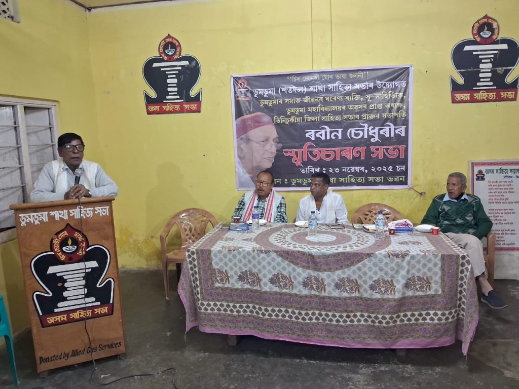 दुमदुमा, प्रेरणा भारती 26नवंबर तिनसुकिया जिला के दुमदुमा सतदल शाखा साहित्य सभा द्वारा प्रतिवर्ष की भांति इस वर्ष भी रविवार को नगर के आजाद रोड स्थित दुमदुमा शतदल शाखा भवन में दुमदुमा सामाजिक जीवन में अग्रणी भूमिका निभाने वाले प्रतिष्ठित साहित्यकार, पत्रकार, अभिनेता, समाजसेवी, दुमदुमा कॉलेज के पूर्व प्राचार्य तथा तिनसुकिया जिला साहित्य सभा के पूर्व अध्यक्ष रोबिन चौधरी की स्मृति सभा का आयोजन किया गया। ज्ञात हो की दिवंगत साहित्यकार रोविन चौधरी का जन्म और निधन दोनों एक ही दिन 23 नवंबर को ही हुआ था। शाम 4.00 बजे से शाखा भवन में शुरू हुए कार्यक्रम का शुभारंभ रोबिन चौधरी के चित्र के समीप दुमदुमा के विशिष्ट व्यवसायी व दिवंगत रोविन चौधरी के परिवार के साथ घनिष्ठ संबंध रखने वाले मंजीत सिंह द्वारा दीप प्रज्वलित कर किया गया। वहीं लोकप्रिय गायक जुबिन गर्ग के चित्र के समीप दीप प्रज्वलित असम साहित्य सभा के तिनसुकिया जिला के प्रतिनिधि मोहन मोरान ने किया।