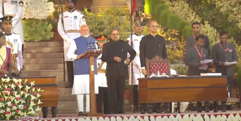 नई दिल्ली, भाजपा के वरिष्ठ नेता नरेन्द्र मोदी ने लगातार तीसरी बार प्रधानमंत्री पद की शपथ ली। राष्ट्रपति द्रौपदी मुर्मू ने राष्ट्रपति भवन में रविवार को आयोजित समारोह में उनको पद एवं गोपनीयता की शपथ दिलाई।