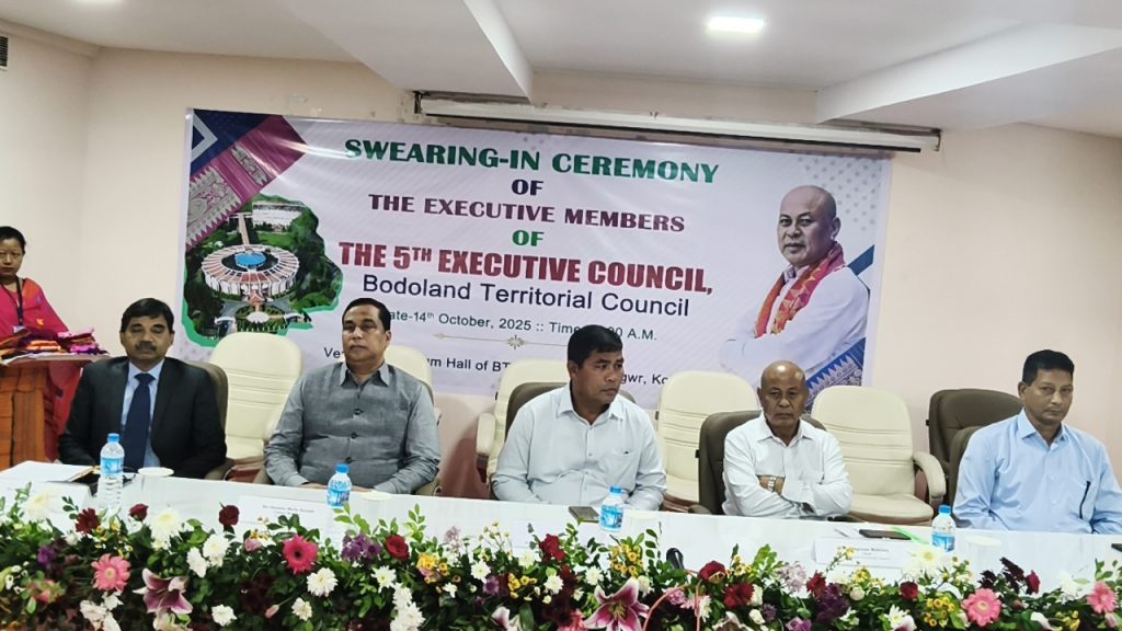 कोकराझार, 14 अक्टूबर: पाँचवीं बोडोलैंड प्रादेशिक परिषद (बीटीसी) कार्यकारी परिषद के नवनियुक्त कार्यकारी सदस्यों का शपथ ग्रहण समारोह कोकराझार के बोडोफा नगर मे स्थित बिटिसी सचिवालय के सभागार मे आज सुबह 11:00 बजे कोकराझार स्थित बीटीसी विधान सभा भवन में आयोजित किया गया।