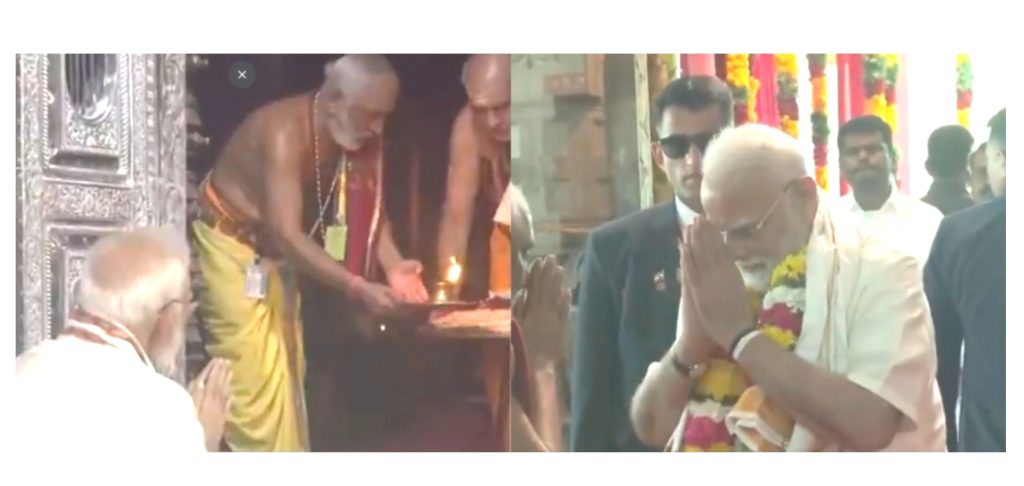 परमकुडी, 6 अप्रैल (हि.स.)। प्रधानमंत्री नरेन्द्र मोदी ने आज रामेश्वरम में स्थित रामनाथस्वामी मंदिर में पूजा अर्चना की।इस दाैरान सुरक्षा के कड़े प्रबंध किए गए। प्रधानमंत्री मोदी ने इससे पहले रामनाथपुरम जिले में बने नए पंबन रेलवे ब्रिज का उद्घाटन किया था। इसके बाद प्रधानमंत्री माेदी रामेश्वरम के रामनाथस्वामी मंदिर पहुंचे और पूजा अर्चना की। इस दौरान मंदिर प्रशासन की ओर से उन्हें पूर्ण कुंभ सम्मान दिया गया। इस मौके पर प्रधानमंत्री के साथ प्रदेश अध्यक्ष के अन्नामलाई और पार्टी के प्रमुख पदाधिकारी मौजूद थे। प्रधानमंत्री मोदी के दर्शन व पूजन को देखते हुए श्रद्धालुओं को सुबह 8 बजे से दोपहर 3 बजे तक रामनाथस्वामी मंदिर में प्रवेश की अनुमति नहीं दी गई।