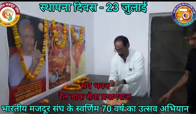प्रयागराज 24 जुलाई: 23 जुलाई 2024 को भारतीय मजदूर संघ की स्थापना का 70 वें वर्ष के रूप में मनाया जा रहा है। इस उपलक्ष में आज भारतीय रेल डाक सेवा कर्मचारी संघ प्रयागराज जिले का नवनिर्मित भवन में स्थापना दिवस का उत्सव का प्रथम बार कार्यक्रम का आयोजन किया गया। जिसमें मुख्य अतिथि के रूप में स्वराज सिंह जी परिमंडलीय सचिव, जगदंबा प्रसाद विश्वकर्मा परिमंडलीय संगठन सचिव, नीलेश शुक्ला परीमंडलीय संगठन सचिव, राहुल चंद्रा मंडलीय सचिव RMS ए डिवीजन प्रयागराज,श्री एन के दयाल कोषाध्यक्ष, श्री अनिल केसरवानी, श्री दीपक कुमार यादव, प्रशांत कुमार की उपस्थिति रही। भारत माता, विश्वकर्मा भगवान एवं श्रद्धेय दांतोपंत ठेंगड़ी जी के चित्रों माला अर्पण कर पुष्प अर्पण किया गया और जय घोष एवं राष्ट्रगान के गाने से कार्यक्रम को समाप्त किया गया।