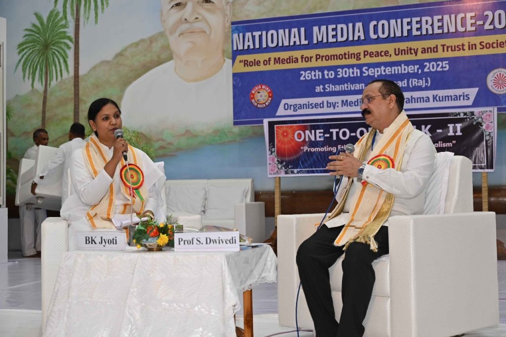 आबू रोड, राजस्थान, 28 सितंबर। ब्रम्हकुमारीज मुख्यालय में चल रहे राष्ट्रीय मीडिया सम्मेलन में विशेष संवाद सत्र में भारतीय जन संचार संस्थान (आईआईएमसी) के पूर्व महानिदेशक प्रोफेसर संजय द्विवेदी ने कहा कि यह कहना ग़लत है कि मीडिया पहले मिशन था और अब प्रोफेशन है। टीवी पत्रकार बीके ज्योति से बातचीत करते हुए प्रोफेसर द्विवेदी ने कहा कि कोई भी समय किसी भी विधा के सिद्धांतों को नहीं बदल सकता। कुछ लोगों के विचलन से मूल्य आधारित पत्रकारिता का मार्ग बंद नहीं होता। यह मिशन थी, है और रहेगी।