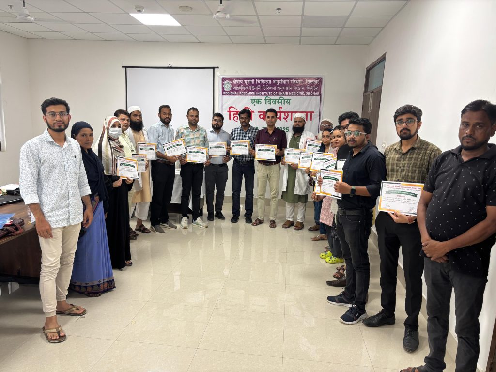 आज दिनांक 20/06/2025 को क्षेत्रीय यूनानी चिकित्सा अनुसंधान संस्थान, शिलचर में राजभाषा विभाग, गृह मंत्रालय, भारत सरकार एवं केंद्रीय यूनानी चिकित्सा अनुसंधान परिषद के निर्देशानुसार राजभाषा वार्षिक कार्यक्रम 2025-26 के अनुपालन एवं कर्मचारियों के राजभाषायी प्रशिक्षण हेतु एक दिवसीय हिंदी कार्यशाला का आयोजन संस्थान के समिति कक्ष में किया गया। कार्यशाला का उद्देश्य संस्थान के अधिकारियों और कर्मचारियों के मध्य कार्यालयी हिंदी के प्रयोग को बढ़ावा देना और व्यवहारिक बनाना है ।