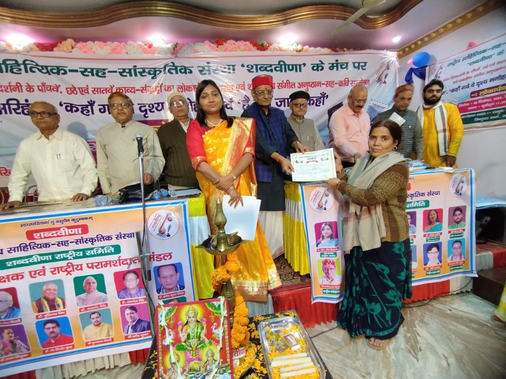 प्रेरणा प्रतिवेदन जहानाबाद, 11 दिसंबर। राष्ट्रीय साहित्यिक-सह-सांस्कृतिक संस्था ‘शब्दवीणा’ के मंच पर शब्दवीणा की संस्थापक-सह-राष्ट्रीय अध्यक्ष प्रो.डॉ. रश्मि प्रियदर्शनी के पाँचवें, छठे, एवं सातवें काव्य संग्रह ‘अरिहंत’, ‘कहाँ गये वे दृश्य मनोहर’ एवं ‘है हमें जाना कहाँ’ के लोकार्पण समारोह एवं शब्दवीणा कवि सम्मेलन में शब्दवीणा जहानाबाद जिला समिति की पदाधिकारी जिला कोषाध्यक्ष एवं शिक्षिका रूबी कुमारी ने अपनी कविता “शहर के शान देख, गउंआ वीरान हे। केतना उदास देख खेत, खलिहान हे। गलती सुधार अपन, चला-चला गाँव में। तीज, त्योहार, छठ, मनावा अपन गाँव में” प्रस्तुत करके खूब वाहवाहियाँ पायीं। कार्यक्रम की आयोजक-सह-संयोजक डॉ. रश्मि प्रियदर्शनी ने श्रीमती रूबी को शॉल ओढ़ाकर कर, माला पहनाकर तथा पुष्प गुच्छ एवं शब्दवीणा उपहार प्रदान करके सम्मानित किया। काव्य पाठ के उपरांत कार्यक्रम की अध्यक्षता कर रहे शब्दवीणा के राष्ट्रीय कोषाध्यक्ष प्रसिद्ध प्रसिद्ध गीतकार कन्हैयालाल मेहरवार ने प्रशस्ति पत्र प्रदान करके सम्मानित किया। मंचासीन अतिथियों में मुख्य अतिथि शब्दवीणा प्रदेश संगठन मंत्री प्रो. (डॉ.) दीनानाथ, विशिष्ट अतिथि शब्दवीणा के राष्ट्रीय परामर्शदाता मंडल के वरिष्ठ सदस्य प्रसिद्ध संगीतज्ञ राजन सिजुआर, गया जिला संरक्षक डॉ. रामसिंहासन सिंह, गया जिला अध्यक्ष जैनेन्द्र कुमार मालवीय, प्यारचन्द कुमार मोहन, राष्ट्रीय प्रचार मंत्री डॉ रवि प्रकाश, राष्ट्रीय उप संगठन मंत्री पंकज मिश्र, कुमार कांत, तबला प्रशिक्षक शब्दवीणा बिहार कोषाध्यक्ष दिनेश कुमार, विनय कुमार सिन्हा, मनीलाल बारिक, डॉ. रामकृष्ण मिश्र, डॉ. सच्चिदानंद सिन्हा आदि थे।