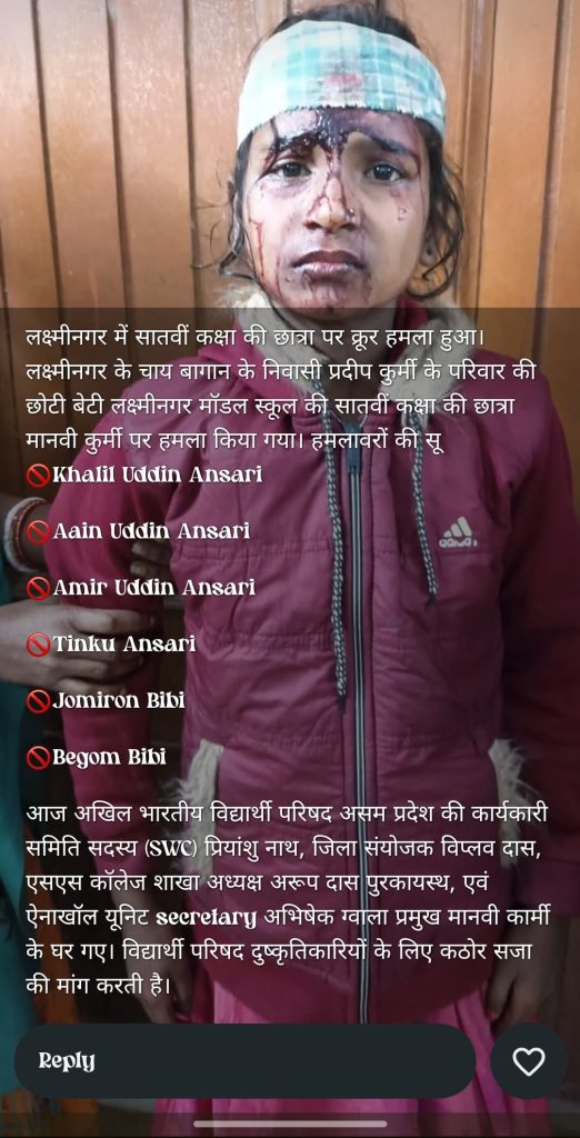 ABVP असम प्रदेश की कार्यकारी समिति के सदस्य प्रियांशु नाथ, जिला संयोजक विप्लव दास, एसएस कॉलेज शाखा अध्यक्ष अरूप दास पुरकायस्थ और आएनाखॉल यूनिट के सचिव अभिषेक ग्वाला ने पीड़ित परिवार से मुलाकात की और इस अमानवीय घटना के खिलाफ कड़ा विरोध जताया। विद्यार्थी परिषद ने कहा कि अगर जल्द से जल्द सभी दोषियों को गिरफ्तार नहीं किया गया, तो वे राज्यव्यापी आंदोलन छेड़ेंगे। लखीनगर इलाके में इस घटना के बाद से तनाव फैला हुआ है। आसपास के लोगों का कहना है कि यह हमला एक परिवार को निशाना बनाने की साजिश थी और इसमें पूरी तरह से सख्त कार्रवाई होनी चाहिए। प्रदीप कुर्मी और उनके परिवार ने मुख्यमंत्री, जिला प्रशासन और पुलिस से न्याय की गुहार लगाई है।