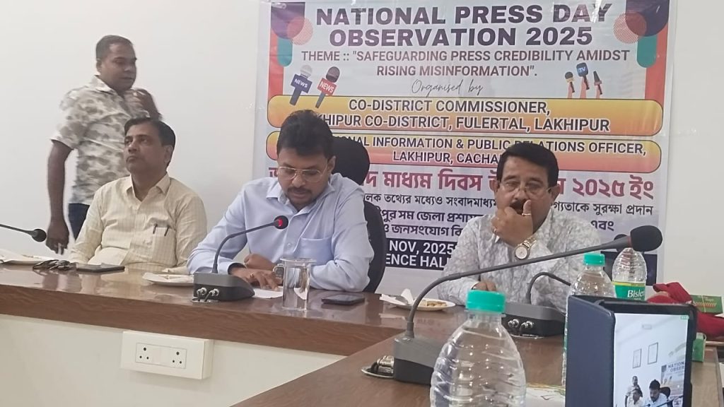 चंद्रशेखर ग्वाला लखीपुर, १६ नवंबर: पुरे देश के साथ-साथ आज लखीपुर सम-जिला में सम- जिला प्रशासन और अनुमंडल सूचना एवं संचार विभाग के प्रबंधन में आज 16 नवंबर 2025 को राष्ट्रीय पत्रकारिता दिवस यानि नेशनल प्रेस दिवस मनाया गया | लखीपुर सह- जिला प्रशासन कॉन्फ्रेंस हॉल में, सह- जिला आयुक्त ध्रुबज्योति पाठक की अध्यक्षता में जिला प्रशासन और अनुमंडल सूचना एवं जनसंपर्क विभाग ने पत्रकारिता से जुड़े सम्मानित पत्रकारों के साथ इस राष्ट्रीय मीडिया दिवस को बहुत ही सुंदर तरीके से मनाया। राष्ट्रीय मीडिया दिवस पर चर्चा का विषय था “भ्रामक सूचनाओं के बीच मीडिया की विश्वसनीयता की सुरक्षा”। राष्ट्रीय प्रेस दिवस की शुरुआत राज्य के राष्ट्रगान के गायन के साथ हुई। गौरतलब है कि उपस्थित पत्रकारों और व्यक्तियों ने, उपरोक्त विषय पर सम्मानित पत्रकारों और विशिष्ट अतिथियों सविस्तार चर्चा किए। पैलापुल नेहरू कॉलेज के प्रधानाचार्य डॉ शुभजीत चक्रवर्ती ने अपने भाषण के माध्यम से पत्रकार और और पत्रकारिता पर भी चर्चा किए। उन्होंने राष्ट्रीय प्रेस दिवस के महत्व को बहुत ही खूबसूरती और सटीक ढंग से समझाया। लखीपुर सह-जिले के वरिष्ठ पत्रकार अब्दुल शुक्कुर बरभुइया ने भी अपने विचार रखे। उन्होंने राष्ट्रीय प्रेस दिवस पर अपने भाषण के माध्यम से राष्ट्रीय प्रेस दिवस के महत्व पर बहुत ही खूबसूरती और सटीक ढंग से चर्चा की।लखीपुर सह- जिला आयुक्त ध्रुबज्योति पाठक ने भी अपने विचार रखे। इस अवसर पर सह-जिला प्रशासन ने उपस्थित सभी सम्मानित पत्रकारों को गमछा ओढ़ाकर सम्मानित किया तथा उपहार भेंट किया ।इस दिन कार्यक्रम में लखीपुर सह- जिले की सहायक आयुक्त और अनुमंडल सूचना एवं जनसंपर्क विभाग की प्रभारी अधिकारी पंखी हजारिका, पैलापुल नेहरू कॉलेज के प्धानाचार्य ,डॉ. शुभजीत चक्रवर्ती, लखीपुर नगर पालिका के अध्यक्ष मृणालकांति दास,नगर पालिका के उपाध्यक्ष एल. रवीन्द्र सिंह, वरिष्ठ पत्रकार श्री अब्दुल शुकूर बरभुइयां, लखीपुर पुर्ब कछाड़ प्रेस क्लब के अध्यक्ष और पत्रकार कबीर अहमद लस्कर, महासचिव और वरिष्ठ पत्रकार पुलक कुमार दास और अन्य सम्मानित पत्रकारगण एवं विशिष्ट आमंत्रित अतिथि उपस्थित थे। 16 नवंबर को राष्ट्रीय प्रेस दिवस समारोह के समापन पर जिलाधिकारी ध्रुबज्योति पाठक ने उपस्थित सभी पत्रकारों को हार्दिक बधाई और धन्यवाद दिया।