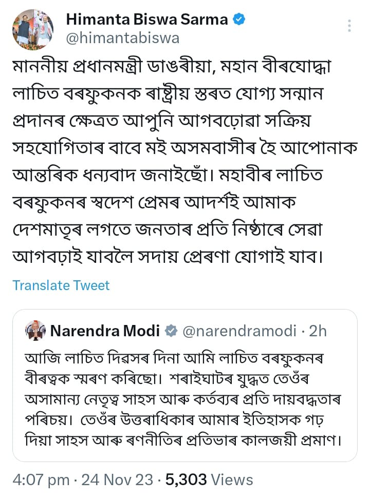गुवाहाटी (असम), 24 नवंबर (हि.स.)। प्रधानमंत्री नरेंद्र मोदी ने आज लचित दिवस के अवसर पर असमिया भाषा में ट्वीट कर लाचित बरफूकन को याद किया। एक्स पर लिखे गए अपने संदेश में प्रधानमंत्री ने लिखा है कि आज लाचित दिवस के अवसर पर हम लचित बरफूकन की वीरता को स्मरण करते हैं। शराईघाट का युद्ध उनके पराक्रम, असमान्य नेतृत्व, साहस और कर्तव्य के प्रति दायित्वबोध का परिचय देता है। उन्होंने कहा कि उनका उत्तराधिकार हमारे इतिहास को समृद्ध बनाता है और साहस एवं रणनीतिक प्रतिभा का कालजयी प्रमाण प्रस्तुत करता है। प्रधानमंत्री के इस संदेश को मुख्यमंत्री डॉ हिमंत बिस्व सरमा ने आज रि-ट्वीट किया।