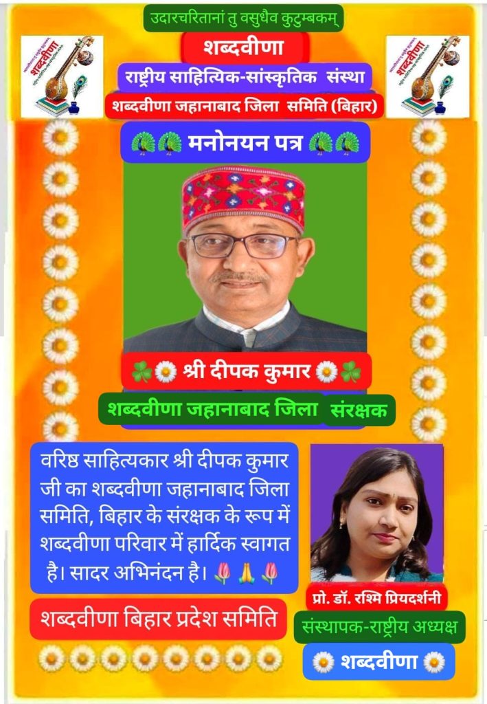 गया। वरिष्ठ कवि दीपक कुमार को राष्ट्रीय साहित्यिक-सह-सांस्कृतिक संस्था ‘शब्दवीणा’ की जहानाबाद जिला समिति का संरक्षक बनाया गया है। जहानाबाद के सम्मानित रचनाकारों में से एक श्री दीपक कुमार के इस मनोनयन पर शब्दवीणा के बिहार प्रदेश संरक्षक प्रो. डॉ. सुबोध कुमार झा, प्रदेश अध्यक्ष डॉ. वीरेन्द्र कुमार, प्रदेश उपाध्यक्ष विनोद शंकर मिश्र, प्रदेश सचिव अर्जुन प्रभात, प्रदेश संगठन मंत्री प्रो डॉ. दीनानाथ, प्रदेश कोषाध्यक्ष दिनेश कुमार, प्रदेश साहित्य मंत्री एवं जहानाबाद जिला अध्यक्ष ललित शंकर, जिला उपाध्यक्ष अशोक प्रियदर्शी, जिला सचिव चितरंजन चैनपुरा, जिला संगठन मंत्री ममता राज प्रिया, जिला कोषाध्यक्ष रूबी कुमारी, जिला साहित्य मंत्री मानसी सिंह, जिला प्रचार मंत्री अंबुज कुमार, बिहार प्रदेश प्रचार मंत्री एवं जहानाबाद जिला अध्यक्ष डॉ गोपाल निर्दोष, गया जिला संरक्षक डॉ. रामसिंहासन सिंह, गया जिला अध्यक्ष जैनेन्द्र कुमार मालवीय, औरंगाबाद जिला अध्यक्ष सुरेश विद्यार्थी, शब्दवीणा जहानाबाद जिला समिति के सभी पदाधिकारियों एवं सदस्यों में डॉ कनक लता तिवारी, निगम राज़, राजमणि मिश्र, प्यारचन्द कुमार मोहन, डॉ. रवि प्रकाश, पंकज मिश्र, मणि लाल बारिक, सरोज कुमार, प्रो सुनील कुमार उपाध्याय, सीमा सिन्हा सहित समस्त शब्दवीणा परिवार ने हार्दिक शुभकामनाएं दी हैं।