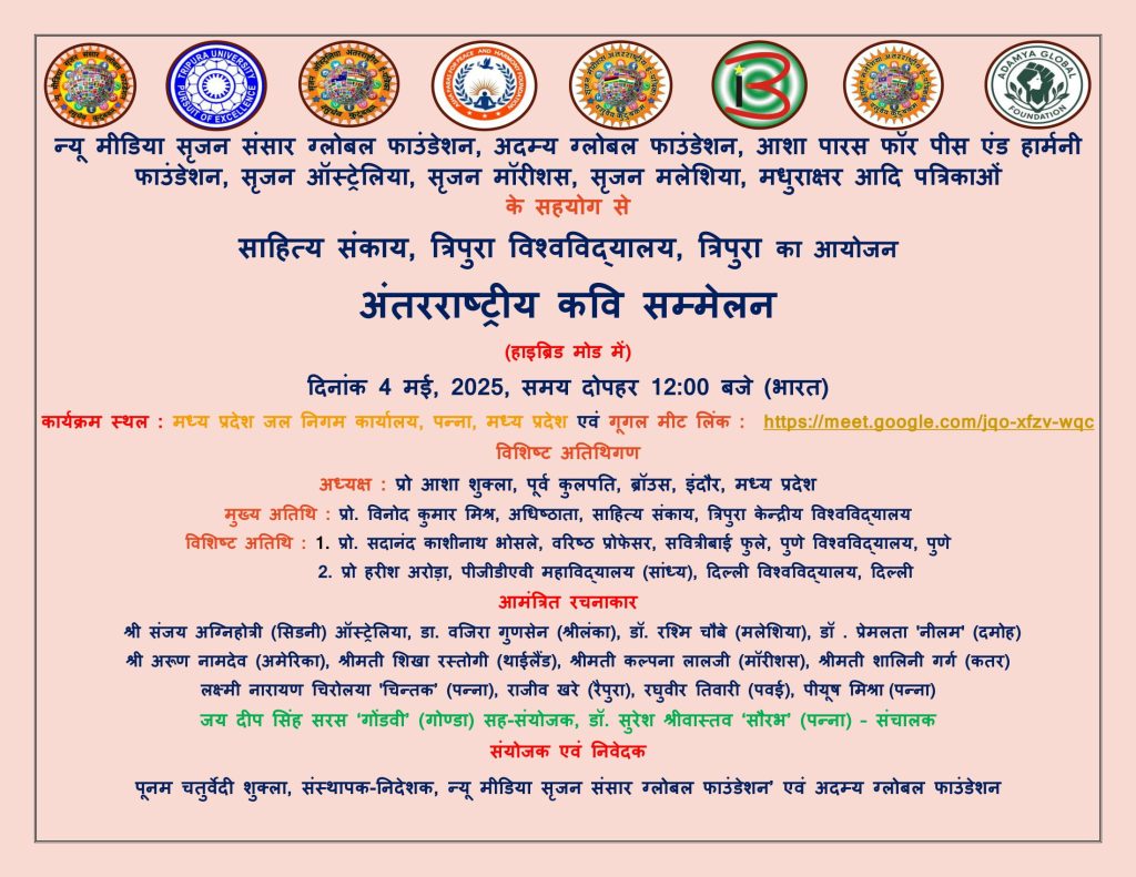 हिंदी साहित्य के वैश्विक विस्तार के लिए एक महत्वपूर्ण आयोजन आगामी 4 मई 2025 को आयोजित होने जा रहा है। त्रिपुरा विश्वविद्यालय, त्रिपुरा के साहित्य संकाय द्वारा न्यू मीडिया सृजन संसार ग्लोबल फाउंडेशन, अदम्य ग्लोबल फाउंडेशन, आशा पारस फॉर पीस एंड हार्मनी फाउंडेशन, सृजन ऑस्ट्रेलिया, सृजन मॉरीशस, सृजन मलेशिया तथा मधुराक्षर जैसी प्रतिष्ठित पत्रिकाओं एवं संस्थाओं के सहयोग से एक अंतरराष्ट्रीय कवि सम्मेलन का आयोजन किया जा रहा है। यह सम्मेलन हाइब्रिड मोड में आयोजित किया जाएगा, जिसमें प्रतिभागी न केवल भौतिक रूप से बल्कि डिजिटल माध्यम से भी जुड़ सकेंगे।
