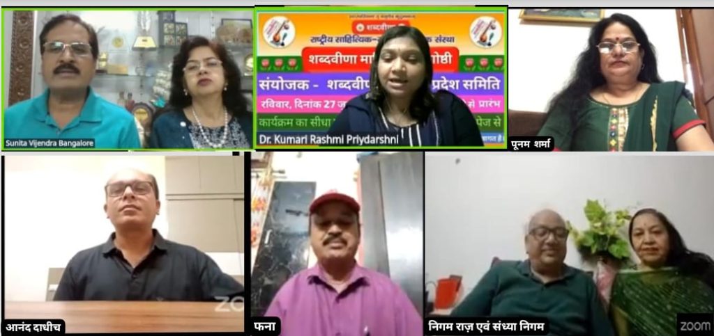 राष्ट्रीय साहित्यिक सह सांस्कृतिक संस्था ‘शब्दवीणा’ की कर्नाटक प्रदेश समिति ने राष्ट्रीय अध्यक्ष डॉ. रश्मि प्रियदर्शनी की उपस्थिति में मासिक काव्य गोष्ठी आयोजित की, जिसमें आमंंत्रित रचनाकारों ने सावन, बारिश, तीज व्रत, प्रेम, देशभक्ति जैसे समसामयिक विषयों पर रचनाएँ पढ़ीं। कार्यक्रम की अध्यक्षता शब्दवीणा कर्नाटक प्रदेश साहित्य मंत्री निगम राज़ ने की, तथा संचालन शब्दवीणा कर्नाटक प्रदेश अध्यक्ष सुनीता सैनी गुड्डी एवं प्रदेश उपाध्यक्ष विजयेन्द्र सैनी ने संयुक्त रूप से किया। कार्यक्रम का शुभारंभ सुनीता सैनी ने सरस्वती वंदना प्रस्तुत करके किया। काव्यगोष्ठी में रचनाकारों ने एक से बढ़कर एक गीत, ग़ज़ल, दोहे एवं मुक्तक रचनाएँ सुनायीं।