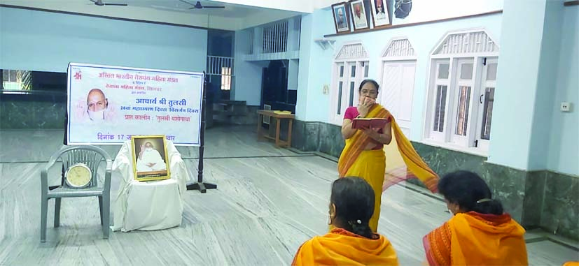तेरापंथ के नवम पटधर आचार्य श्री तुलसी का आज 26 वाँ महाप्रयाण दिवस का कार्यक्रम शीलचर के जैन भवन में आयोजित किया गया। कार्यक्रम का शुभारंभ तेरापंथ महिला मंडल की अध्यक्षा श्रीमती प्रेम सुराणा के नमस्कार महामंत्र के उच्चारण से हुवा। उसके पश्चात तुलसी अष्टकम का संगान श्रीमती कुसुम सुराणा, श्रीमती प्रेम सुराणा व श्रीमती रश्मि सांड द्वारा किया गया। 15 मिनिट तक सामुहिक जप अनुष्ठान का आयोजन किया गया। गुरूदेव तुलसी के विभिन्न अवदानों के बारे में तेरापंथ सभा के मंत्री तोलाराम गुलगुलिया, महिला मंडल की अध्यक्षा श्रीमती प्रेम सुराणा, उपाध्यक्ष श्रीमती रेखा चोरडिय़ा व श्रीमती कुसुम सुराणा ने प्रकाश डाला। अंत मे गुरुदेव तुलसी का भजनों के द्वारा यशोगान किया गया।