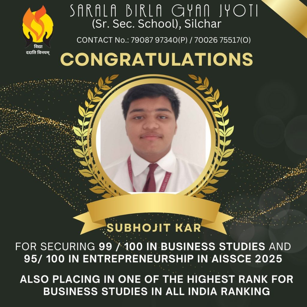 शिलचर स्थित सरला बिड़ला ज्ञानज्योति स्कूल के छात्र शुभजीत कर ने सीबीएसई की उच्च माध्यमिक परीक्षा में बिजनेस स्टडीज विषय में देशभर के टॉपर्स में अपना नाम दर्ज कराकर शिलचर समेत पूरे उत्तर-पूर्व को गौरवान्वित किया है। शुभजीत ने बिजनेस स्टडीज में 100 में से 99 अंक प्राप्त कर इस विषय में सर्वोच्च अंकों वाले छात्रों में स्थान पाया है।