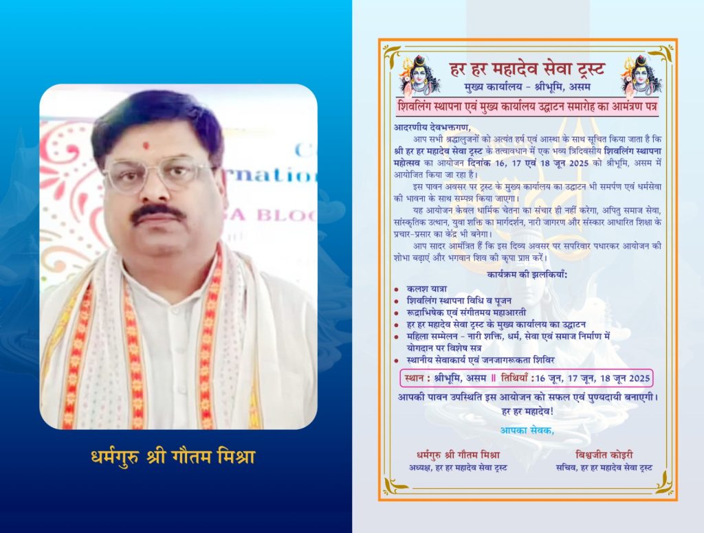 सिंगलाछोड़ा केवल प्रतिष्ठित युवा समाजसेवी विश्वजीत कोइरी ने एक प्रेस विज्ञप्ति के माध्यम से हर हर महादेव सेवा संस्थान की ओर से सभी श्रद्धालुजनों को सादर आमंत्रण किया है। आगामी दिनांक 16, 17 एवं 18 मई 2025 को असम राज्य के श्रीभूमि जिले स्थित लक्ष्मी टी एस्टेट (सिंगलाछड़ा) में श्रीकामरूपेश्वर महादेव शिवलिंग की स्थापना एवं उत्तर-पूर्व क्षेत्र के प्रधान कार्यालय के भव्य उद्घाटन कार्यक्रम का आयोजन किया गया है।