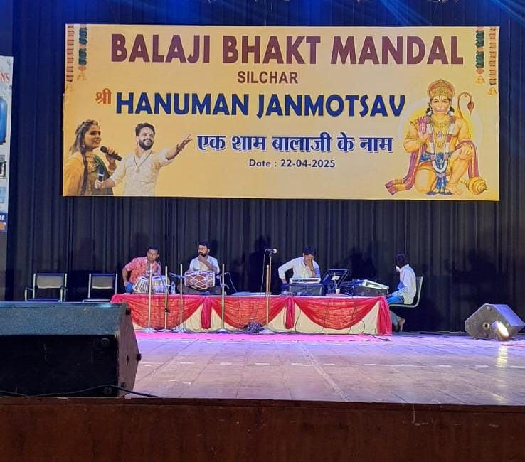 शिलचर, 22 अप्रैल: बालाजी भक्त मंडल, शिलचर द्वारा श्री हनुमान जन्मोत्सव के पावन अवसर पर एक भव्य भजन संध्या का आयोजन किया गया। इस आयोजन में राजस्थान से पधारे सुप्रसिद्ध भजन सम्राट लेहरू दास वैष्णव, लोकप्रिय भजन गायिका सोनू कंवर सहित अन्य कलाकारों ने एक से बढ़कर एक भावपूर्ण भजनों की प्रस्तुति देकर श्रद्धालुओं को भावविभोर कर दिया।