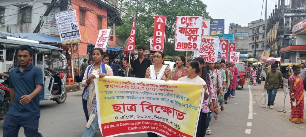 कछार, 5 अप्रैल: केंद्रीय विश्वविद्यालय प्रवेश परीक्षा (सीयूईटी) को रद्द करने और पारंपरिक पद्धति से महाविद्यालयों में प्रवेश की मांग को लेकर ऑल इंडिया डेमोक्रेटिक स्टूडेंट्स ऑर्गनाइजेशन (एआईडीएसओ) की कछार जिला समिति ने आज एक जोरदार विरोध मार्च का आयोजन किया। यह मार्च दोपहर 2 बजे संगठन के उकीलपट्टी स्थित जिला कार्यालय से शुरू होकर जिला उपायुक्त कार्यालय तक पहुँचा, जहाँ संगठन ने असम विश्वविद्यालय के कुलपति के नाम एक ज्ञापन सौंपा।
