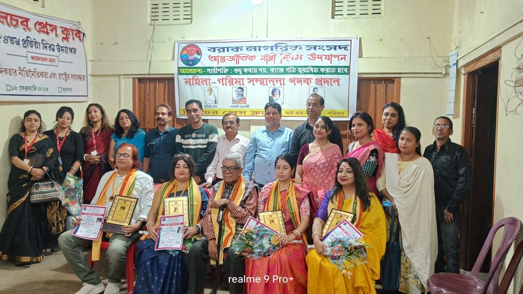 सिलचर, 8 मार्च | रानू दत्ता की रिपोर्ट – अंतर्राष्ट्रीय महिला दिवस के अवसर पर, बराक नागरिक संसद की पहल पर सिलचर प्रेस क्लब में एक भव्य कार्यक्रम आयोजित किया गया, जिसमें महिलाओं के अधिकारों और समानता की जरूरत पर बल दिया गया। इस मौके पर समाज के विभिन्न क्षेत्रों में उत्कृष्ट योगदान देने वाली चार प्रतिष्ठित महिलाओं—सामाजिक कार्यकर्ता एवं शिक्षाविद् सुचित्रा देव, कछार जिला परिषद की पूर्व उपाध्यक्ष लवली चक्रवर्ती, शिक्षाविद्, उद्यमी एवं साउथ पॉइंट स्कूल की प्रधानाध्यापिका कृष्णा डे, और सामाजिक कार्यकर्ता एवं राजनीतिक हस्ती मधुमिता पाल को “महिला गरिमा सम्मान पदक” से सम्मानित किया गया।