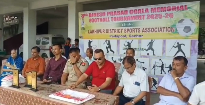 चंद्रशेखर ग्वाला लखीपुर, 15 जुन : लखीपुर जिला खेल संघ द्वारा आयोजित स्वर्गीय दिनेश प्रसाद ग्वाला मेमोरियल फुटबॉल टूर्नामेंट का आज उद्घाटन हुआ। यह कार्यक्रम आज दोपहर 2 बजे पैलापुल स्थित लखीपुर जिला खेल संघ के खेल मैदान में आयोजित किया गया। उद्घाटन समारोह में आमंत्रित मुख्य अतिथि दिवंगत मंत्री दिनेश प्रसाद ग्वाला की पत्नी मणि ग्वाला थीं। जिला खेल संघ की ओर से उन्हें स्मृति चिन्ह व उत्तरीय देकर सम्मानित किया गया। तत्पश्चात जिला खेल संघ के मुख्य संरक्षक प्रदीप कुमार दे द्वारा झंडोत्तोलन किया गया तथा दिवंगत मंत्री दिनेश प्रसाद ग्वाला की पत्नी द्वारा फीता काटकर टूर्नामेंट का उद्घाटन किया गया।इस अवसर पर मोनी गोआला और अन्य आमंत्रित अतिथिगण उपस्थित थे। आज का उद्घाटन मैच जयपुर झोलाई हाजम क्लब बनाम डिगोर मार स्पोर्टिंग क्लब के बीच हुआ। लखीपुर सम जिला सहायक आयुक्त लक्ष्य जोती गोगोई सहित अन्य आमंत्रित अतिथिगण प्रत्येक खिलाड़ी से मुलाकात की और शुभकामना संदेश देकर मैच का उद्घाटन किया।