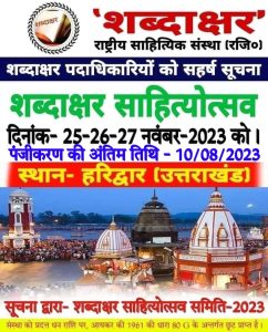 आगामी 25 नवंबर से तीन दिवसीय “शब्दाक्षर हरिद्वार साहित्योत्सव-2023” का होगा भव्य आयोजन November 24, 2023 Read More »